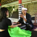 Kombinasi pembacaan tangan, prosesi pembersihan energi negatif melalui melukat, dan ritual pemberkatan spiritual.